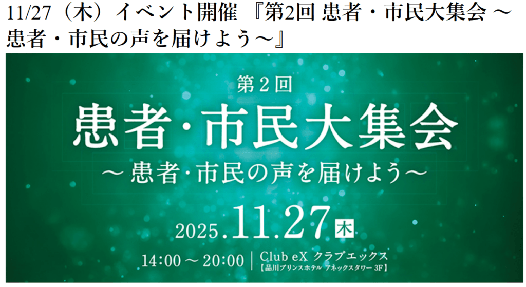 2025年11月27日(木)に『第2回 患者・市民大集会 〜患者・市民の声を届けよう〜』が開催されます。